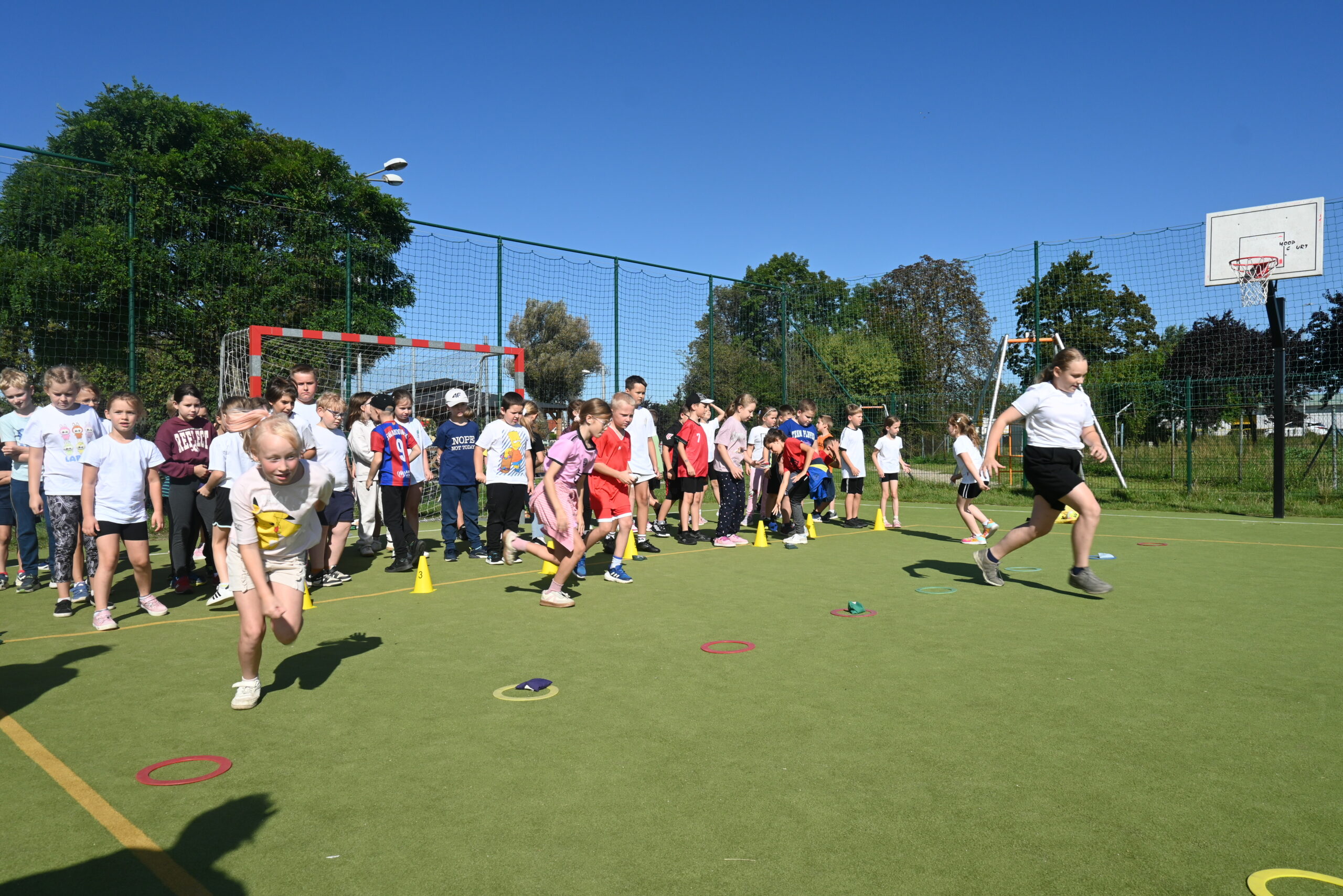 Narodowy Dzień Sportu to pierwszy dzień po przerwie wakacyjnej, kiedy uczniowie wychodzą z ławek, by na świeży powietrzu spędzić całą lekcję, poświęcając całą energię na aktywność fizyczną. Młodsze klasy podjęły wyzwanie wyścigów w rzędach. Nikt nie liczył punktów, bo liczyła się dobra zabawa. Starsi uczniowie wybrali cztery ognie, kwadranta i piłkę nożną. Każdy tego dnia okazał się zwycięzcą, bo choć nikt nie otrzymał medalu, w rywalizacji, królowała idea fair play, a to najpiękniejsza nagroda.