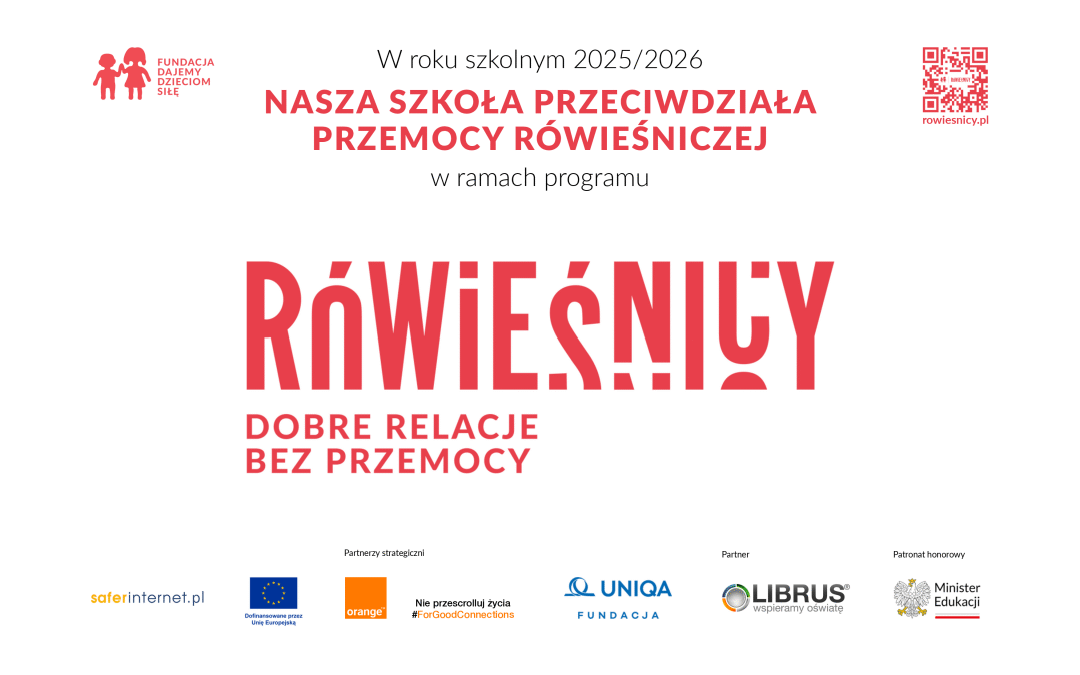 W tym roku szkolnym nasza szkoła dołączyła do programu organizowanego przez Fundację Dajemy Dzieciom Siłę:  RÓWIEŚNICY. Dobre Relacje Bez Przemocy! To ogólnopolski program profilaktyczny, który umożliwia przeprowadzenie diagnozy problemu cyberprzemocy i przemocy rówieśniczej w szkole. Zakłada on również realizację tematów związanych z przemocą w klasach VII i VIII.